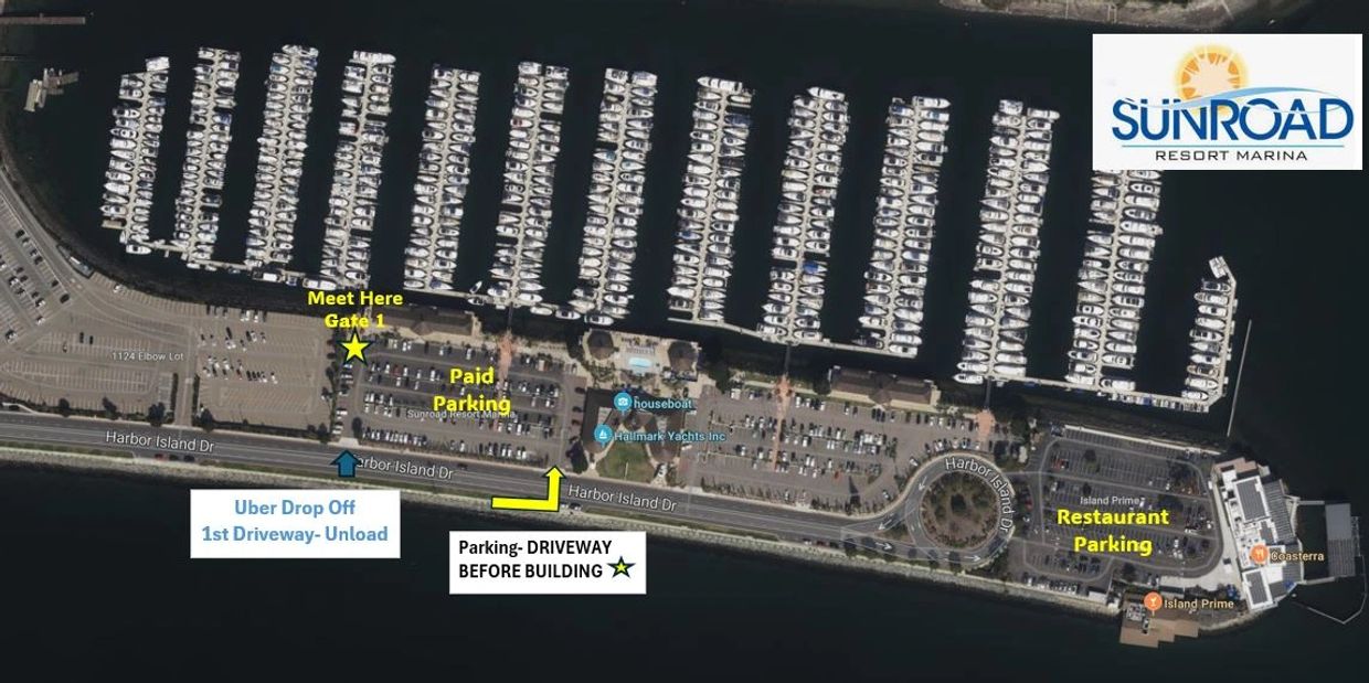 Parking is located onsite at the Marina. Enter the 1ST Driveway before marina building. Pull through gate, use credit card as ticket